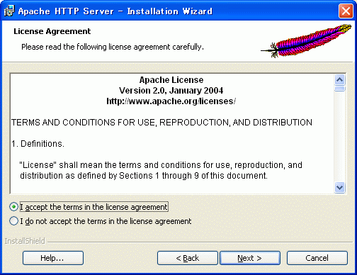 Apacheのライセンス(使用許諾事項)の説明が表示されている画面です。