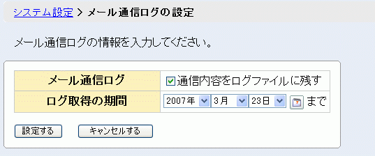 1.システム設定 > メール通信ログの設定 をクリックします。