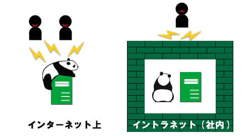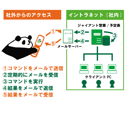 アットパンダの「コマンドメール」では、サーバーをインターネットに公開したり、 高額な環境を用意することなく、携帯電話で社内に設置したシステムの情報を 取得/登録することが可能です。 サーバーは社内のイントラネットの中に設置するだけ、あとはメールサーバーの 設定を行えば、情報取得のリクエストや登録情報をメールを介して行います。 このため、面倒なネットワーク環境の変更や、追加機器などがなくても外出先から 社内の情報を扱うことが可能になります。