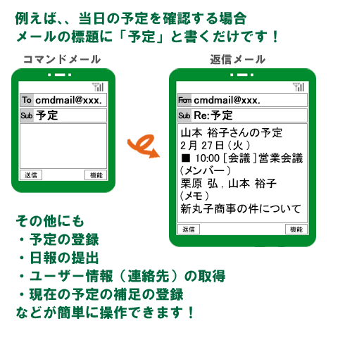 今や、携帯でのメールは誰もが使えるようになってきました。携帯電話でのイン ターネット閲覧はやったことがないかたでも、メールの送受信はよく行うのでは ないかと思います。 社内システムへのアクセスを、携帯メールを利用することで、携帯ブラウジングに 不慣れな方でも、簡単に利用できます。